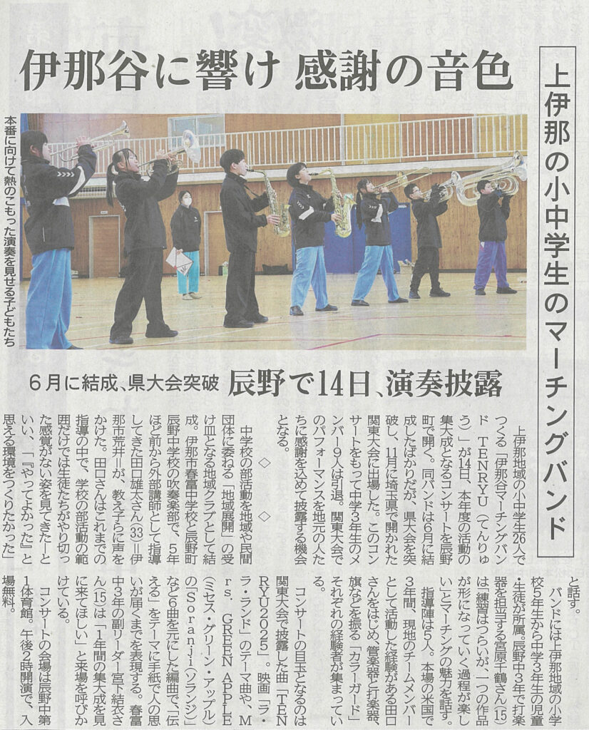 12月11日の信濃毎日新聞でTENRYUが紹介されました!12月14日に演奏会「HOME COMEING 2025」を開催するので、ぜひお越しください!